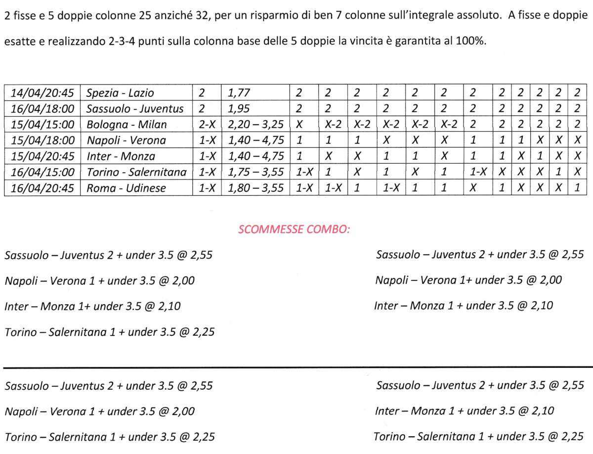 In questo numero troverete i pronostici serie A di Mimmo in programma il 14 e 17 aprile 2023, validi per la 30^ giornata di campionato di serie A – stagione 2022/2023 ed il sistema di Paolucci.