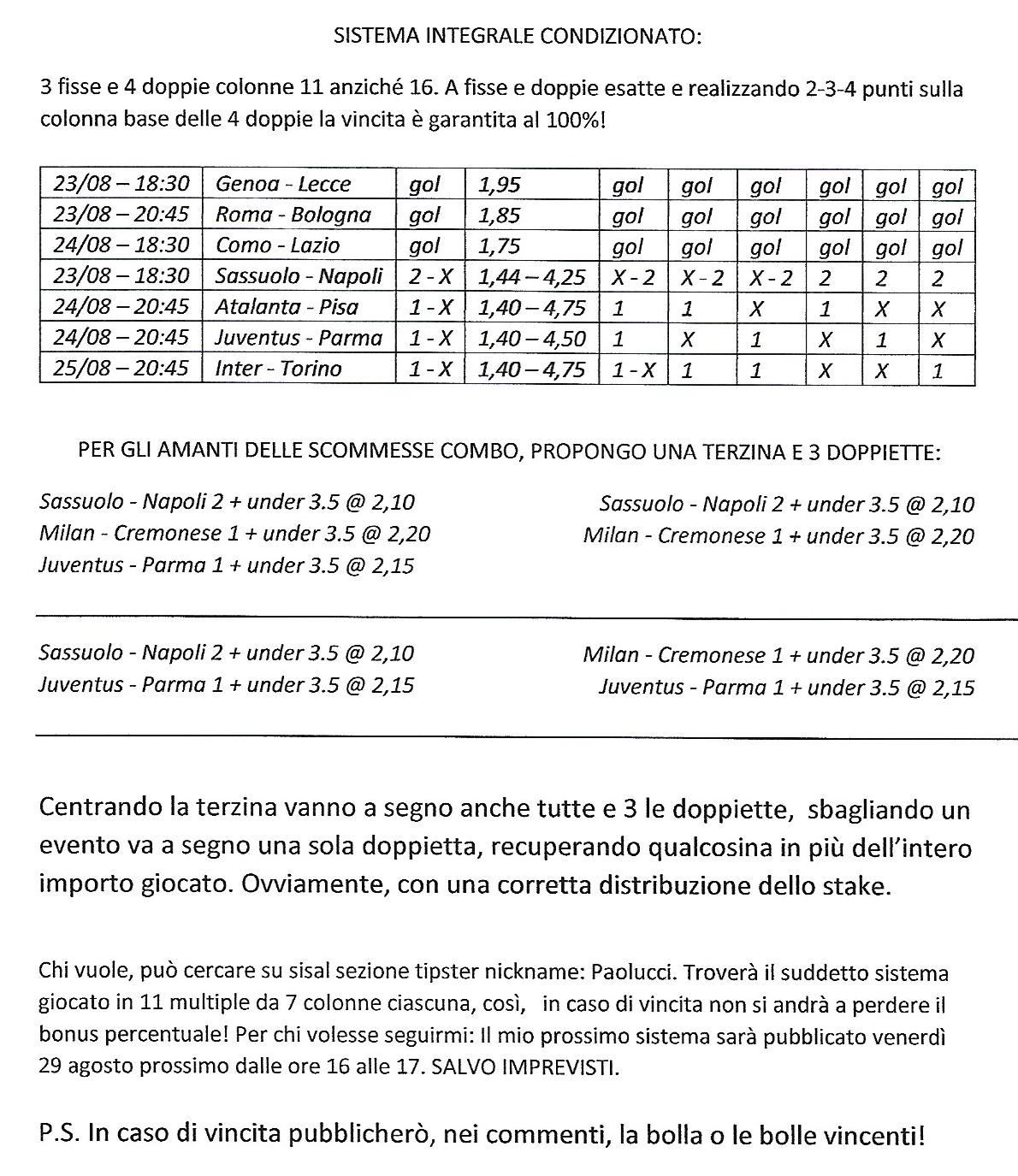 In questo numero troverete i pronostici serie A di Mimmo ed il Sistema di Paolucci delle gare in programma il 23, 24 e 25 agosto 2025,  valide per la 1^ giornata di campionato di serie A – stagione 2025/2026. Il nostro articolo prevede pronostici studiati oggi, analisi previsioni e bollette calcio già fatte e pronte per essere giocate.