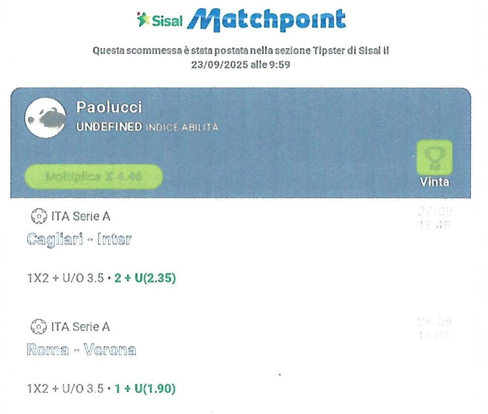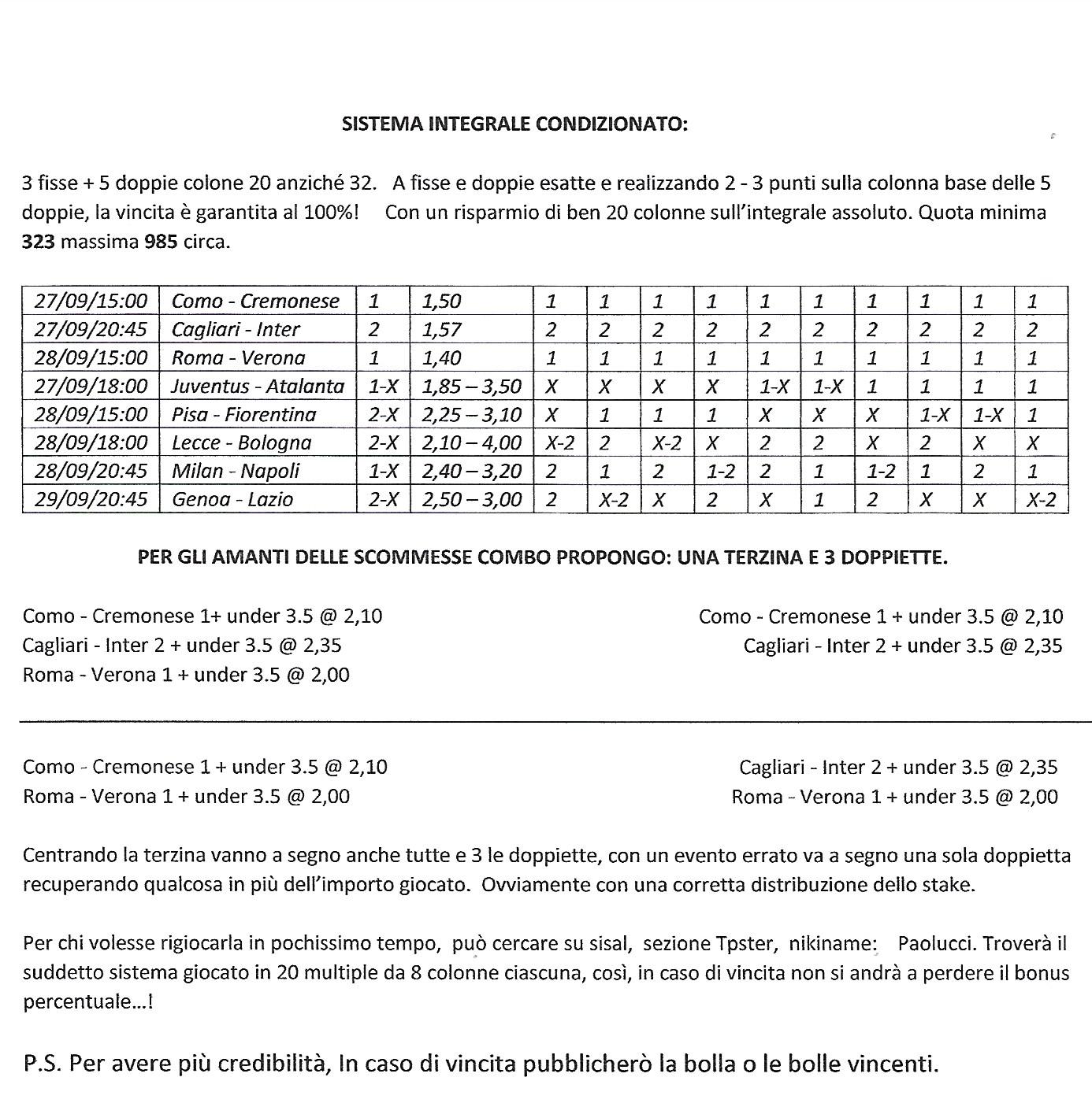 In questo numero troverete i pronostici serie A di Mimmo ed il sistema di Paolucci delle gare in programma il 27, 28 e 29 settembre 2025, valide per la quinta giornata di campionato di serie A – stagione 2025/2026. Il nostro articolo prevede pronostici studiati oggi, analisi previsioni e bollette calcio già fatte e pronte per essere giocate.