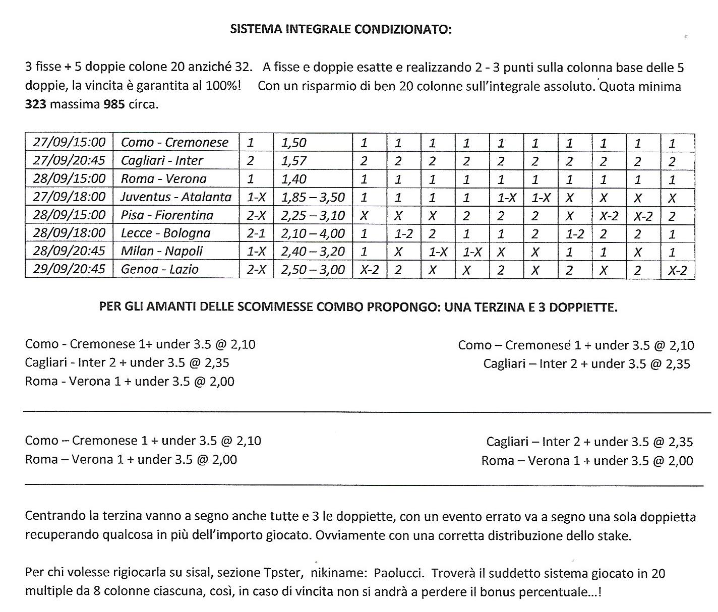 Mister Paolucci buonasera, nel sistema pubblicato, c’è una piccola defezione nelle partite di Pisa-Fiorentina e Milan-Napoli. Il primo segno non corrisponde con le successive combinazioni. Si sarà trattato sicuramente di un errore di distrazione.