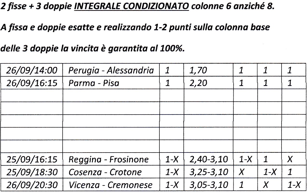 26.09. 20:30 L.R. Vicenza – Cremonese x (3,05) coprire 1