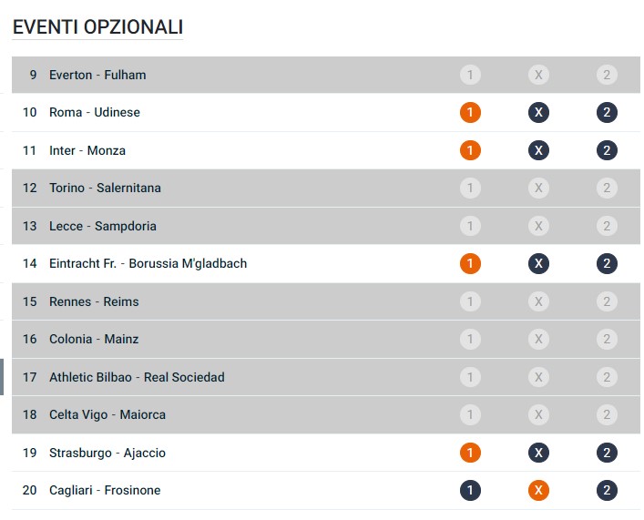 La schedina è composta dai primi 2 eventi obbligatori del palinsesto ed 1 evento opzionale a scelta.