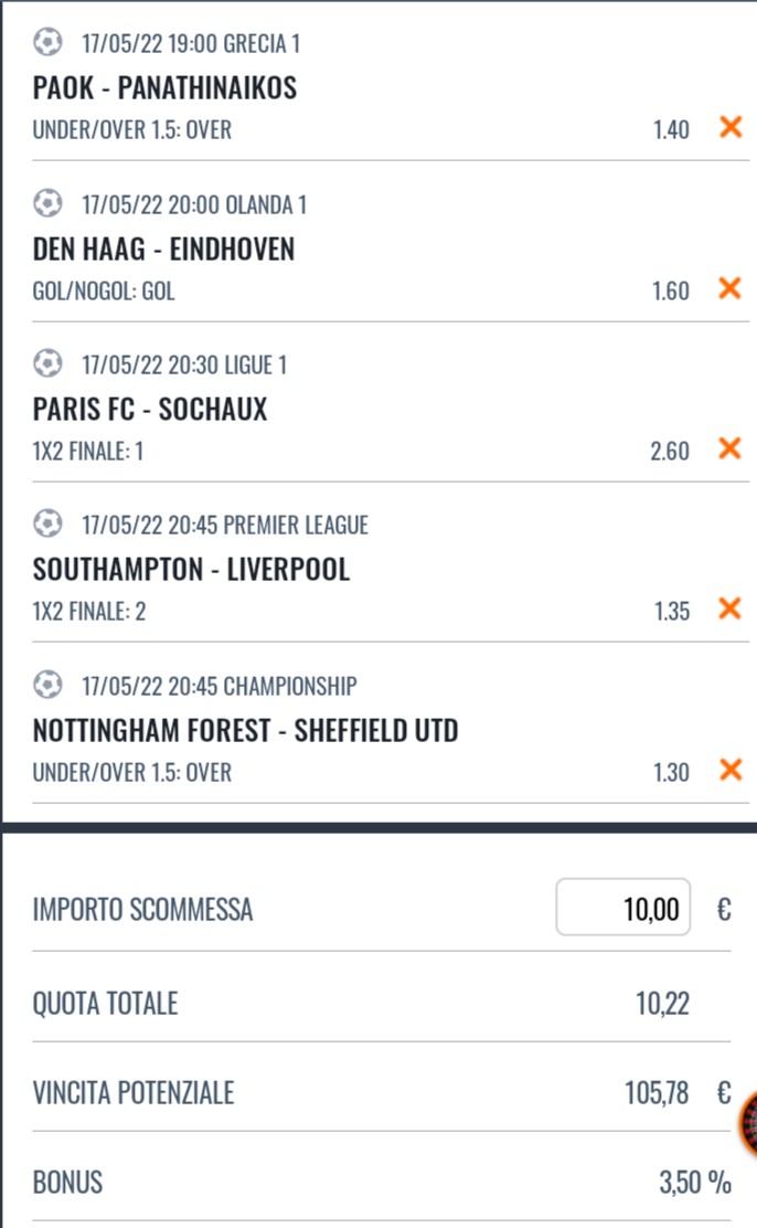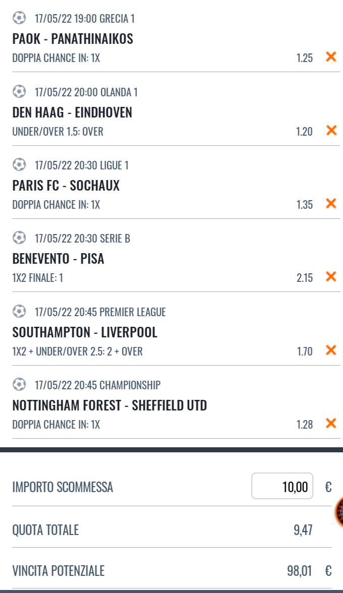 17/05 – 20:45 Southampton – Liverpool 2+Ov2.5 (1.70)