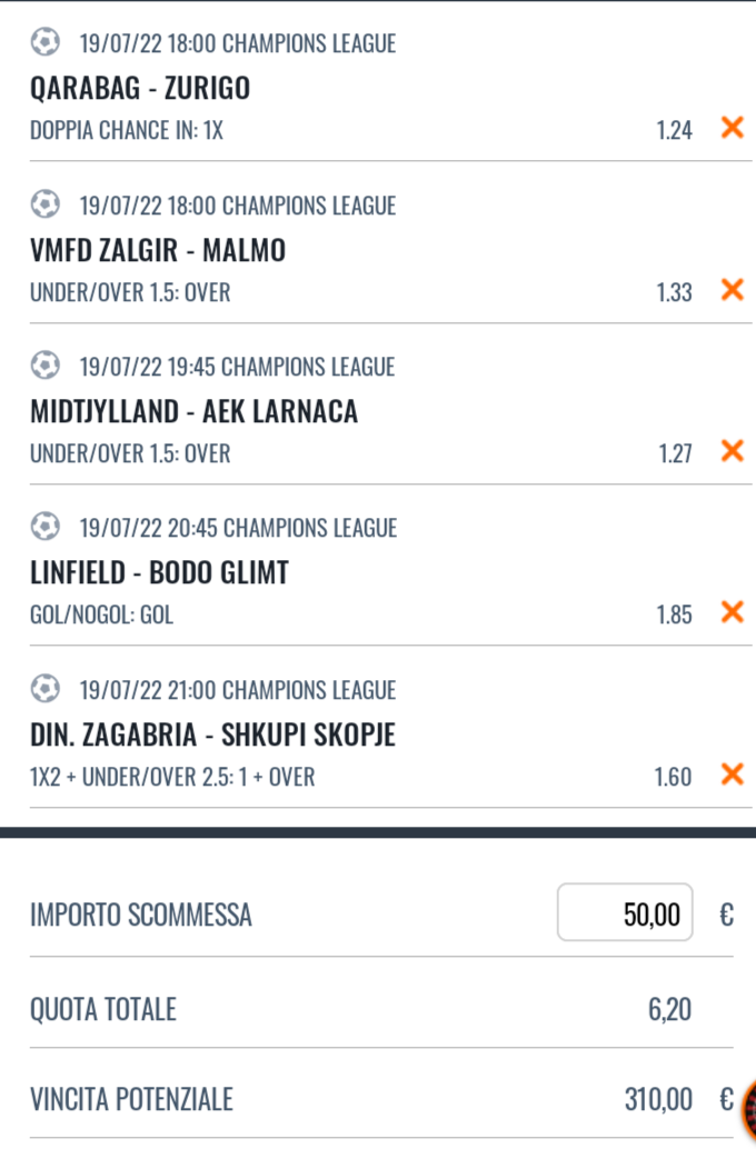 19/07 | 18:00 | Qarabag – Zurigo | 1x | 1.24 |