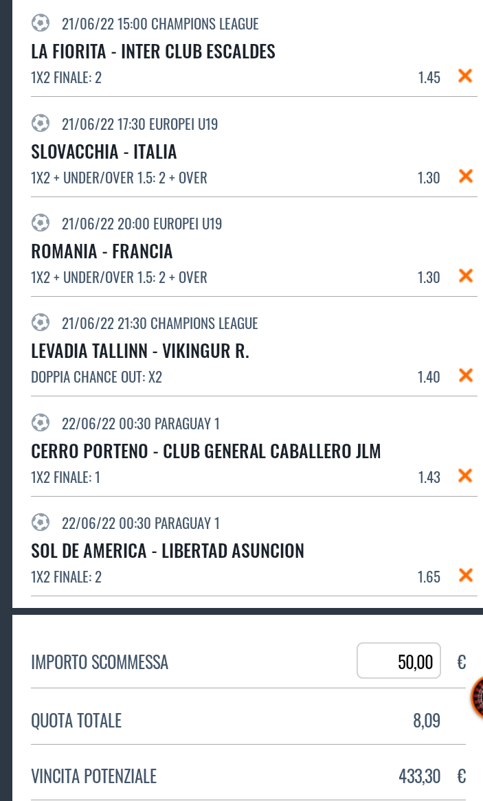 Schedina pronta del 21/06/2022