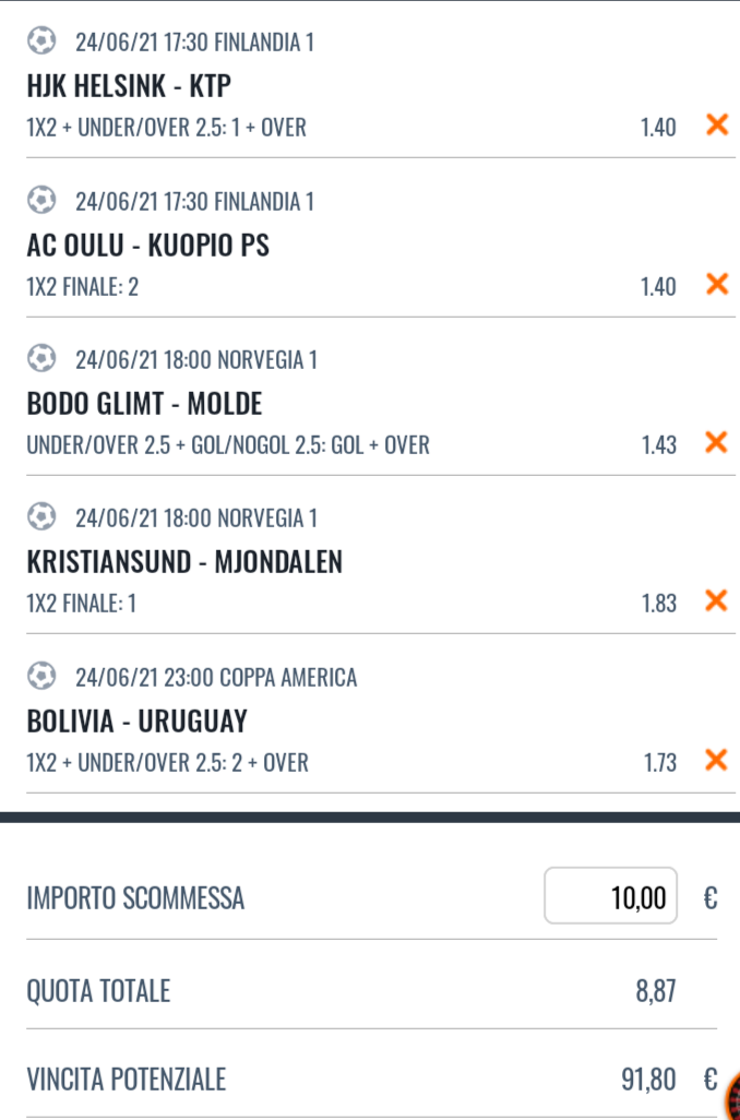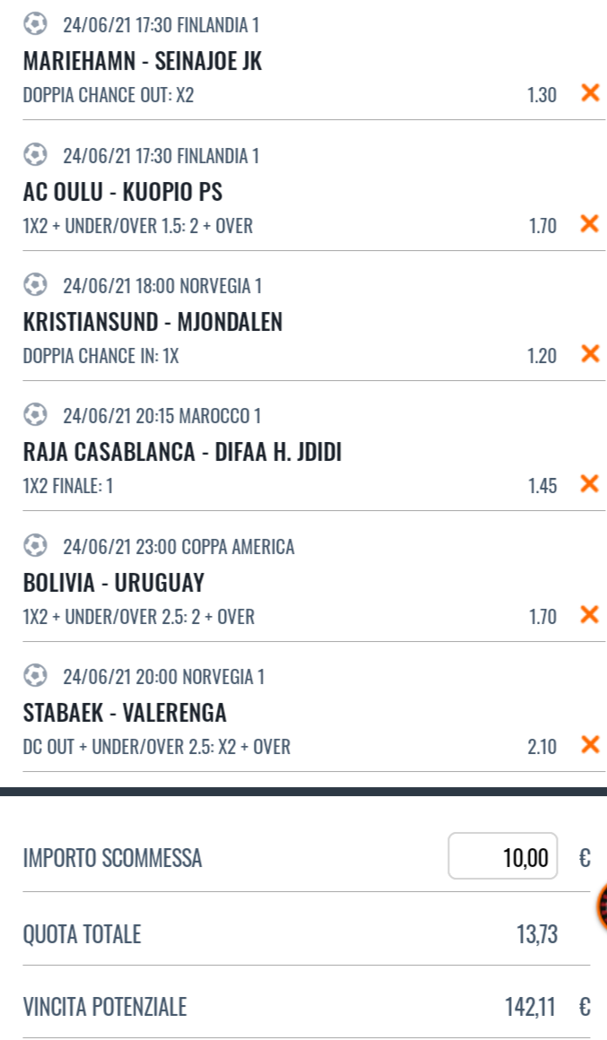 I pronostici di Oggi su Campionato Norvegese, Finlandese e Copa America in programma il 24 Giugno 2021.