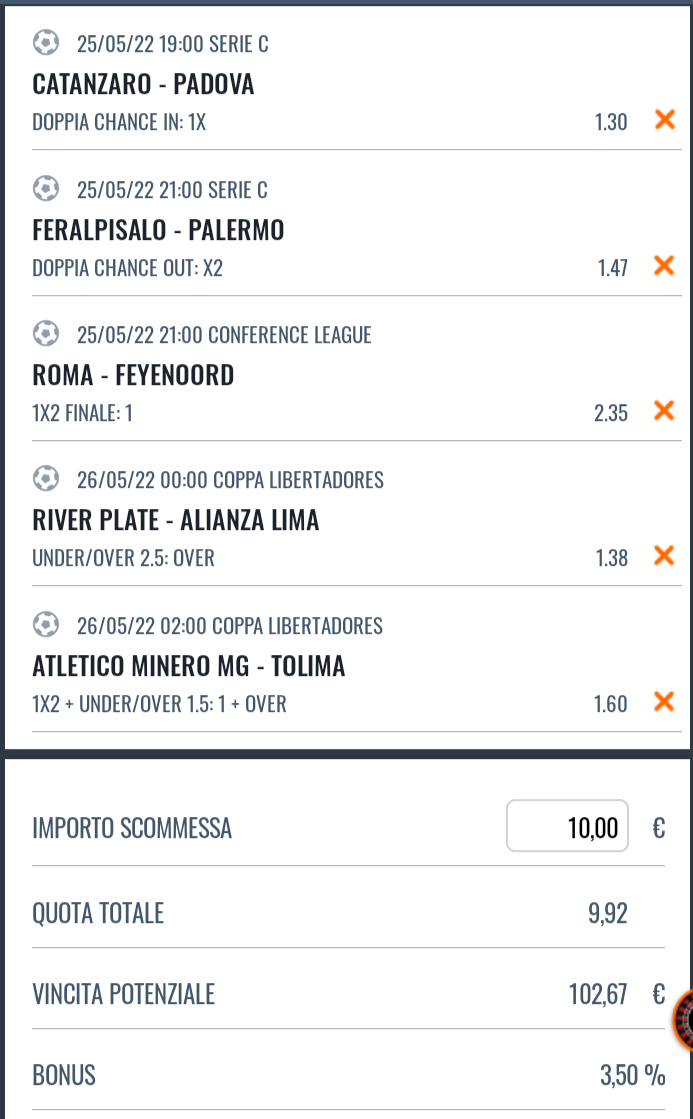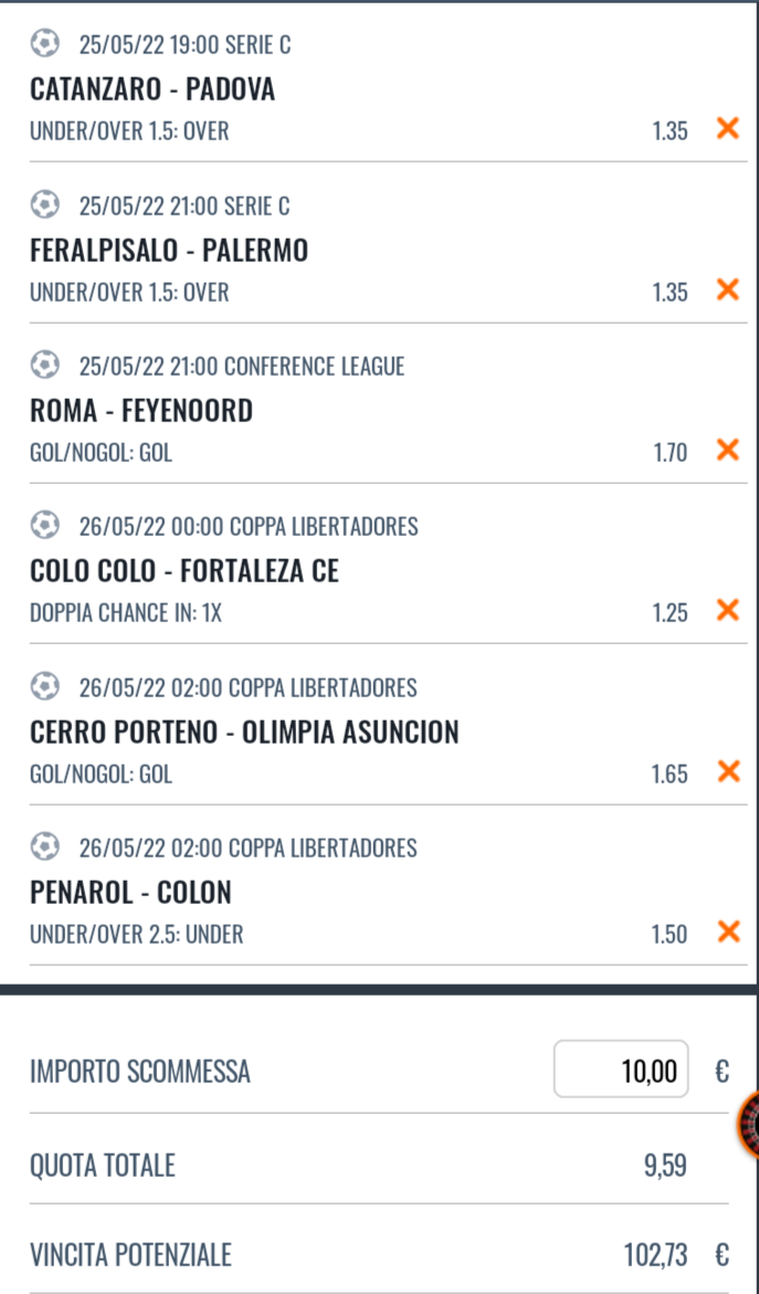 I pronostici di Oggi su Finale UEFA Conference League, Copa Libertadores e Play-Off Serie C, in programma per oggi 25 Maggio 2022.